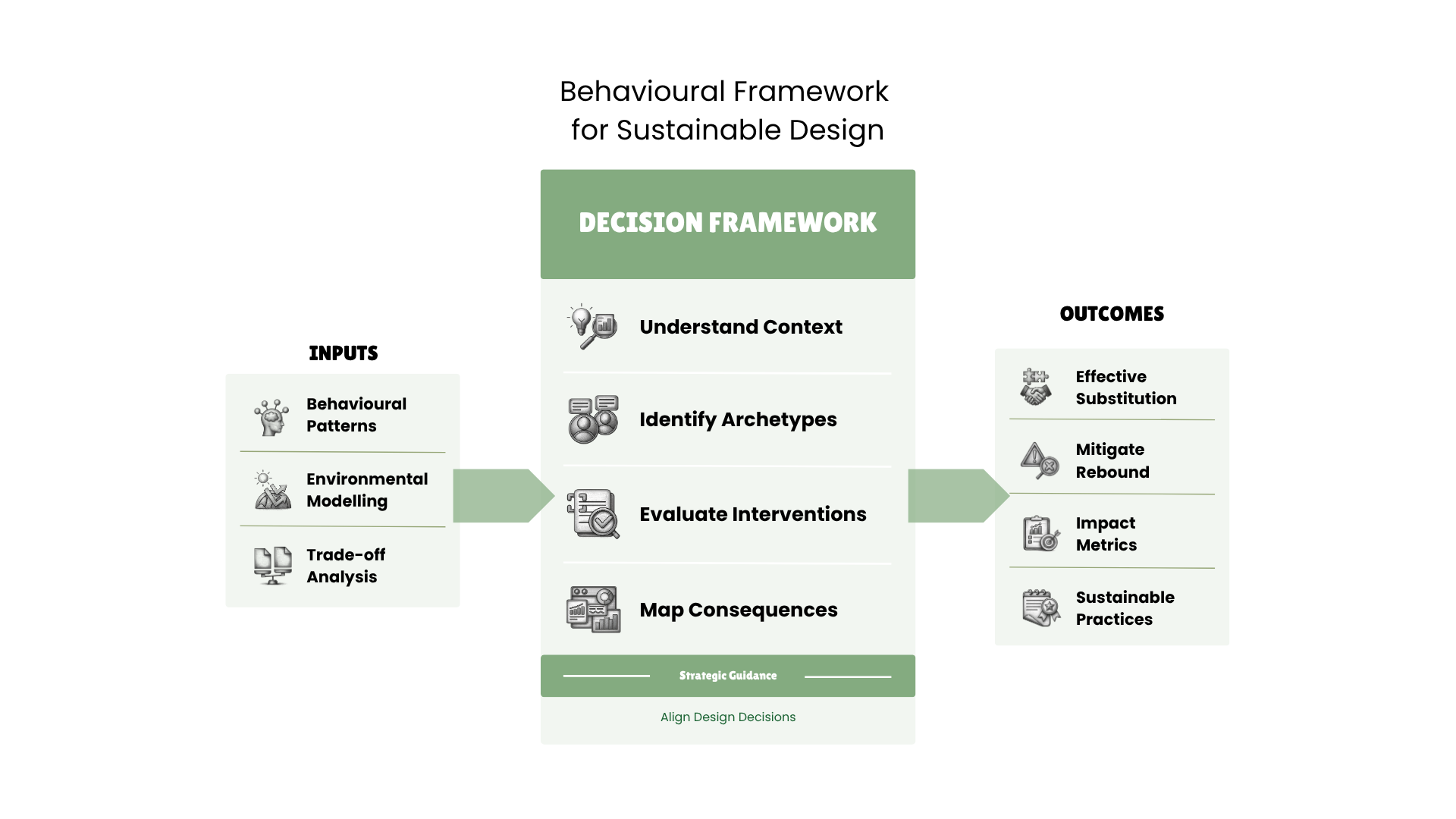 A practical research-based design-strategy framework, created to inform design decisions that can reduce the gap between intent and impact in sustainability decisions